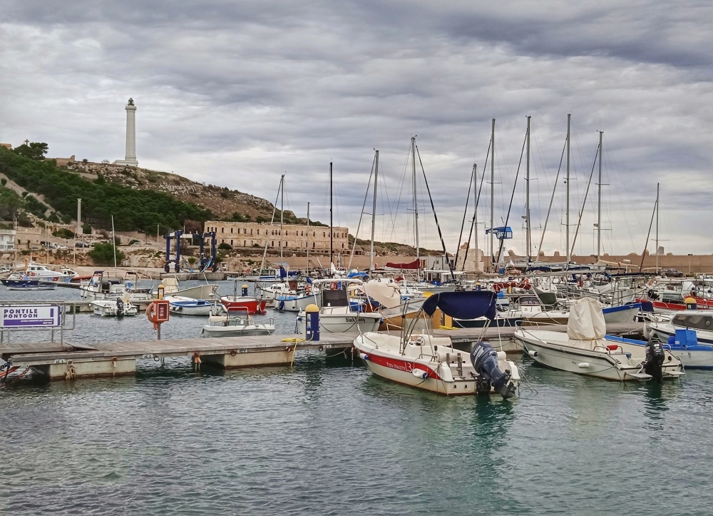 Fentről rá is nézhetsz mindkettőre, a Punta Meliso hegyfokról. Van itt még világítótorony (Faro di Santa Maria di Leuca) meg a kolostor (Santuario di Santa Maria de Finibus Terrae), és innen tart le, a kikötő felé egy monumentális dupla lépcső, középen vízeséssel (szezonban biztos van benne víz).
