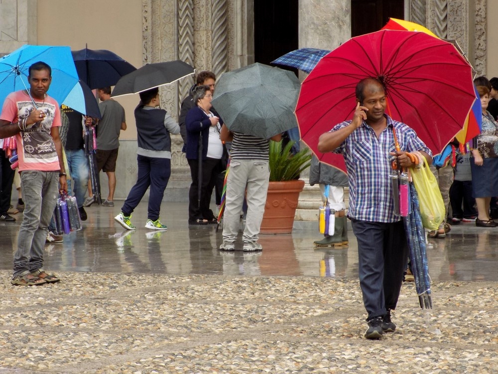 Ahogy megered az eső, azonnal előkerülnek az esernyőárus fekete srácok. Ahogy csendesedik a zápor, úgy megy le az ár, mire egészen eláll, már akár egy euróért is vehetnék egy ernyőt… Száraz időben ugyanezek a fiúk szelfibotokat kínálnak.