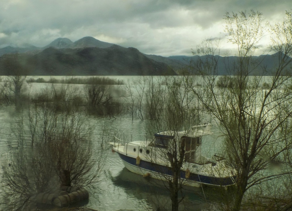 A vonatból nézem a Skhodrai-tavat, eközben nem zavar, hogy az időjárás cseszik kényeztetni: esik, eláll, esik, fúj, nem áll el, és ez így megy napokig.
