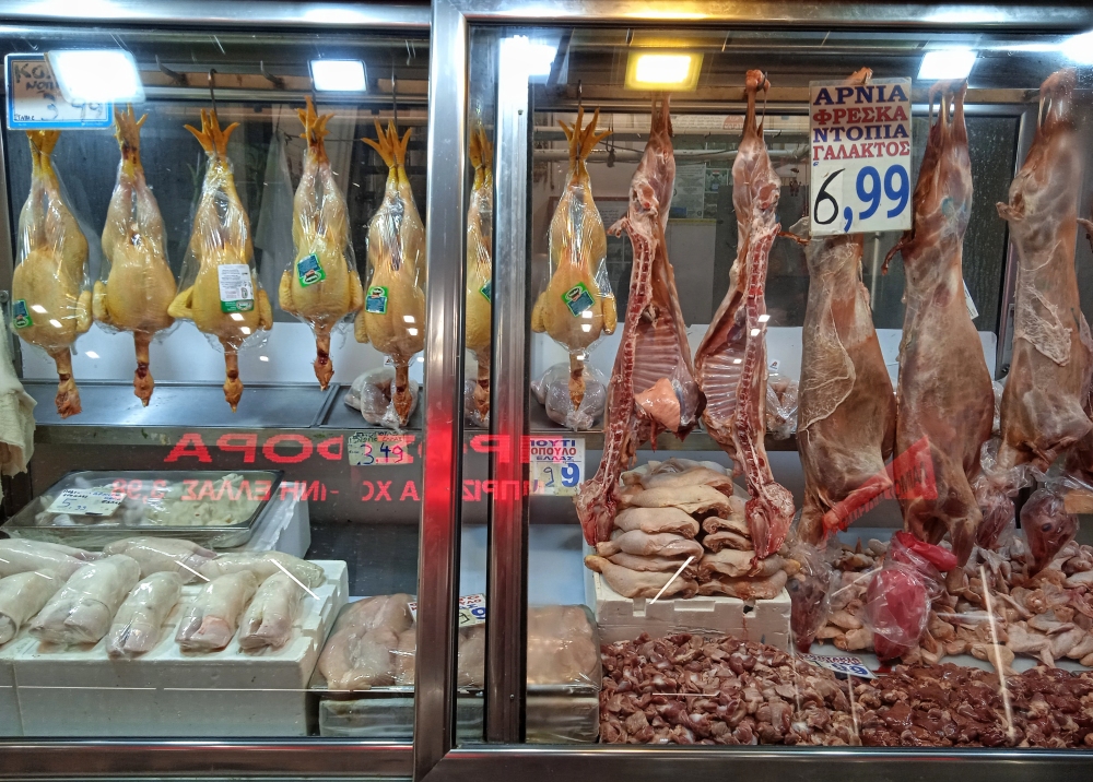 A Varvakios Market, azaz a piac közel van az Omoniához, onnan a Monastiraki felé kell indulni a gasztrokalandért. Halak és más tengeri lények, gyönyörű és olcsó hentesáru a csarnokban, zöldség-gyümölcs az utca túloldalán a placcon. Meg hát a hangulat. Birka- meg marhakolbászt azonnal vettem, aztán jöttek az olajbogyók. Az egyik árusnál, ahol volt legalább tizenötféle (natúr, sózott, napon szárított, fűszerezett, idei, tavalyi, sötét, világos, etc.), és majd’ mindet végig is kóstoltatta velem, beszereztem hazahozásra. Ott vákuumcsomagolta nekem az utcán!