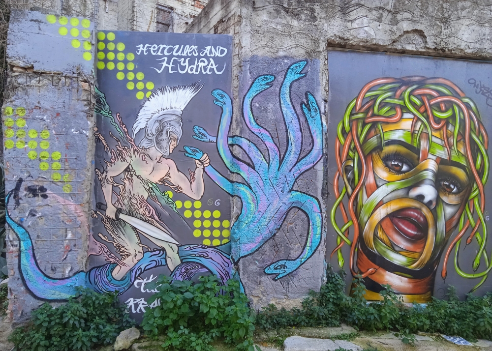 Street art Anafiotikában. Anafiotika Athén festői kis negyede az Akropolisz alatt, a Plaka nevű régi történelmi városrészben. A zegzugos utcák, lépcsősorok, vendéglők és apró ortodox templomok mellett kószálva azt veszed észre, hogy egy csomó fal színesre van graffitizve, és valahogy mégis komplex egészet alkot a város szövetével.