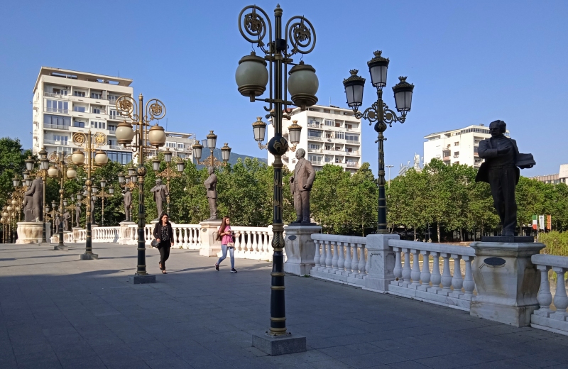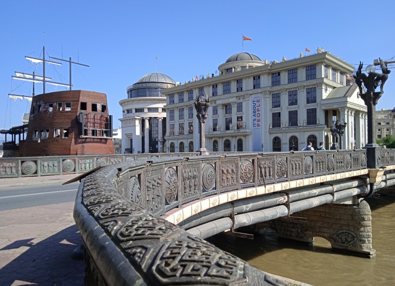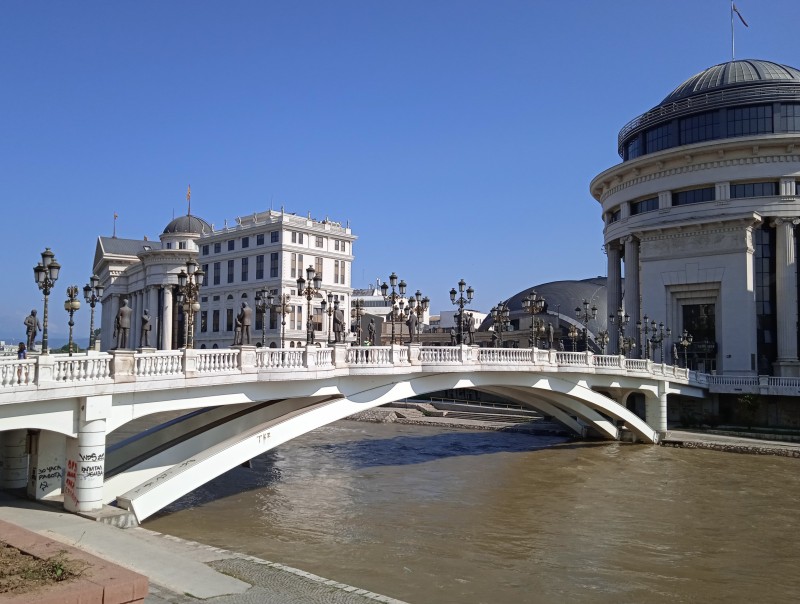 Szkopjét a Vardar szeli ketté. A folyó felett számos híd ível át, köztük a 15. századi Kőhíd, és a két szobrokkal zsúfolt híd egymás mellett, a Civilizációk hídja és a Művészet hídja, amikhez képest a prágai Károly-híd kutya füle, már ha az alakok számát nézzük. Úgy általában is rengeteg a szobor a városban, csak 2010 és 2014 között 136-ot állítottak.