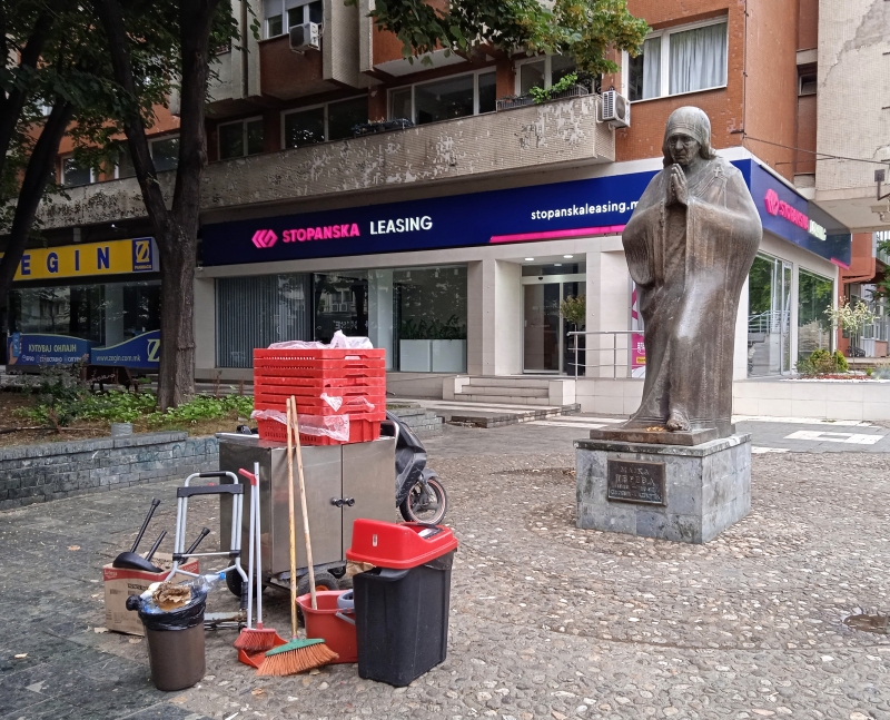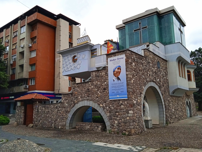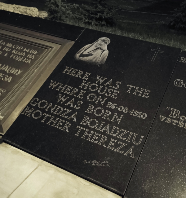 Szkopje Teréz anya szülővárosa, aki se macedón, se makedón, hanem albán, és születése idején (1910. augusztus 26.) a város az Oszmán Birodalom része volt, és Üsküpnek nevezték. A szent asszony szülőháza már nem áll, helyén emléktáblát helyeztek el. Sőt, miként azon olvasható: ezen a helyen épült a Bojaxhiu család háza, és Teréz anyának 1980. június 27-én Szkopje város díszpolgárává nyilvánítása alkalmából ő maga ültetett egy fenyőfát. Ezt tavaly tönkretette a vihar, de már ültettek újat a helyére. Nem is egyet, rögtön ötöt, az egész család család (Kola apa, Drane anya, Agija, Lazri és Agnes Gonxha, aki Teréz anya lett) emlékére.