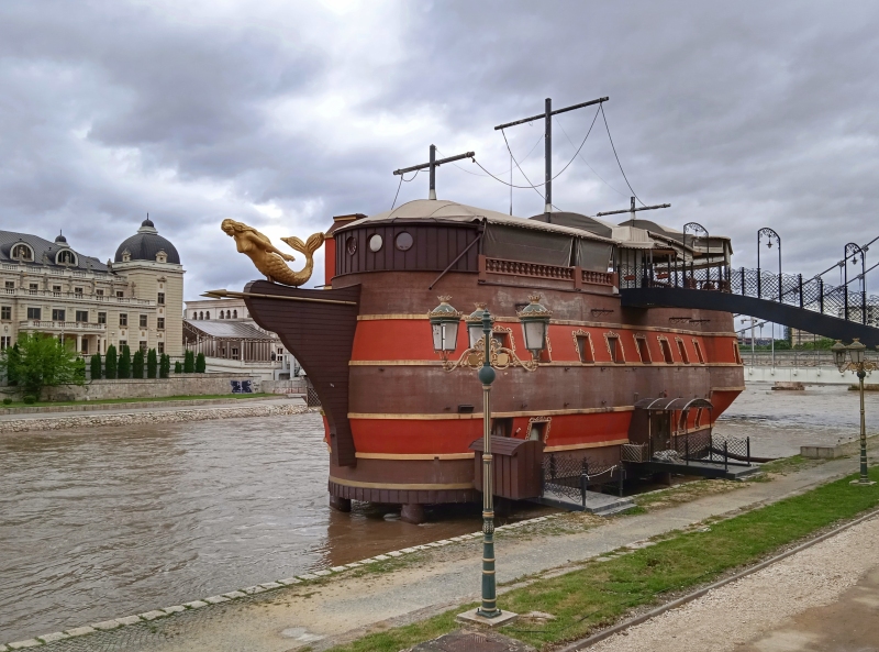 A központban három méretes hajó horgonyzik a Vardaron (a cikk végén, a képgalériában van róluk fotó). A középső egy étterem, a két szélső közül az egyik meglehetősen romos, félig mintha le is lenne égve, a harmadiknak meg szép az orrdísze.
