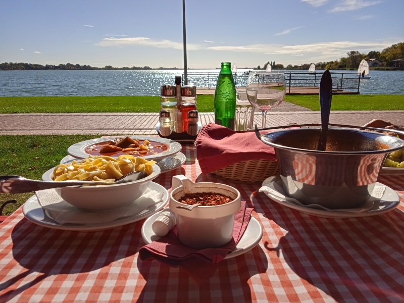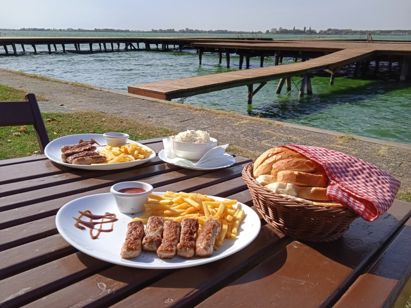 A legjobb vendéglő a környéken a Halászcsárda (Riblja čarda), kockás abroszokkal, változatos és laktató halételekkel, a tóra nyíló kilátással. Másik alkalommal igen méretes gyerekadag csevapot ettünk a Kapetanski Rit nevű helyen, szintén a tóparton, kissé lejjebb. Emögött van a mai termálfürdő és aquapark.