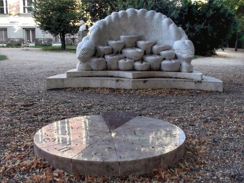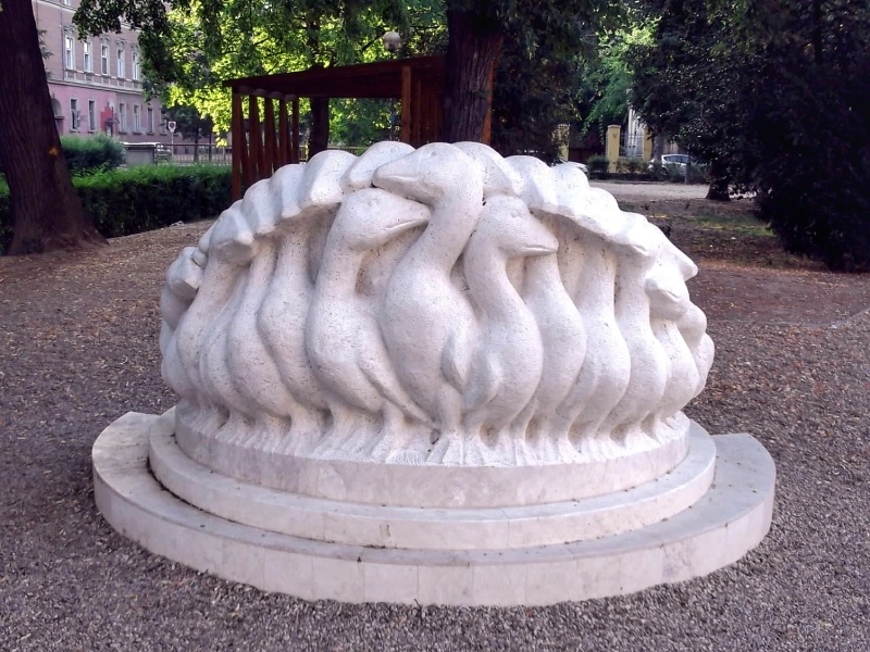 A Somogyi Tamás jegyezte kompozícióban találunk egyebek mellett libákat formázó íves elemet fehér kőből, fekvő kutyát bronzból, kígyót márványlapon. „Ezek az állatok a Szent Márton legendákban szerepelnek, egyúttal asztrális szimbólumok is”, állt anno az átadáson kapott sajtóanyagban. Nyilván ez azt asztrális szerep indokolja a horoszkópos malomkövet. Bár kutya és kígyó csak a kínaiban szerepel, liba meg ott se. A hivatalos leírás szerint „a filagória alatti bronz dombormű a remeteséghez vonzódó Mártont ábrázolja és egyben felidézi a püspökké választásához kapcsolódó, sokfelé ismert történetet”.