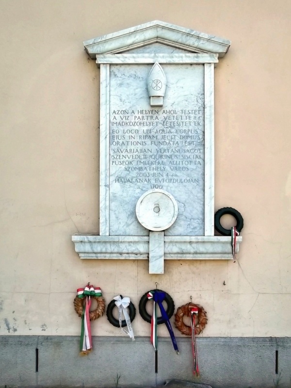 A 2003-ban, Quirinus halálának 1700. évfordulóján avatott emléktábla Tornay Endre András szobrászművész alkotása, a hídkorláton lévő bronzból készült cingulum (püspöki öv) Veres Gábor munkája.