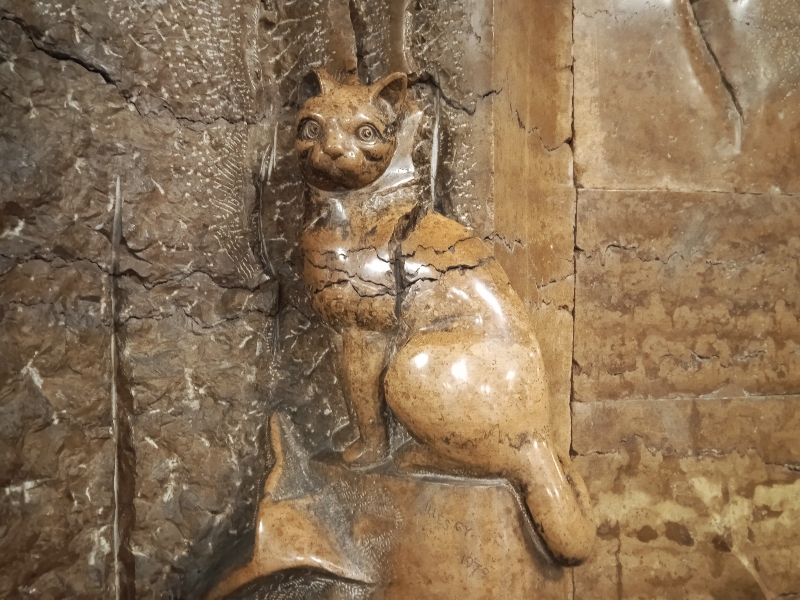 A nyolcvanas évek óta figyeli a pesti járókelőket ez a macsek, a Kálvin téri aluljáróban található vörösmárvány dombormű részeként. A modell Maci kandúr volt, a szobrász, Illés Gyula cirmos cicája.