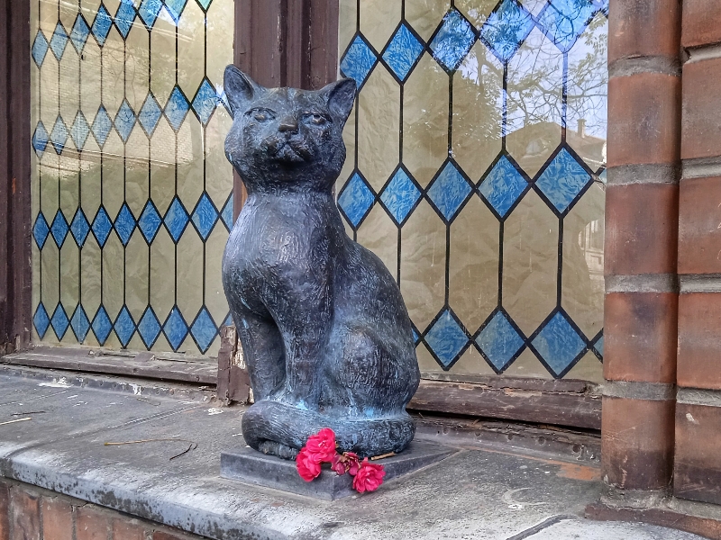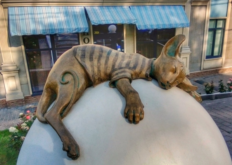 A Fekete-tenger partján, a Lanzseronon pihen Tatjána Stikalo szobrászművész alkotása. Izjum cica egy nagy hófehér labdán fekszik, és fajtáját tekintve szfinx, azaz kopasz macska, egészen jól áll neki a csíkos tengerészpóló. Odesszai utamról (2021. augusztus) a beszámoló itt, természetesen vannak benne macskák, mert az odesszai utcák és terek elképzelhetetlenek nélkülük. Macskaszobor is akad még, ez a fotó is az ukrán kikötővárosban készült:
