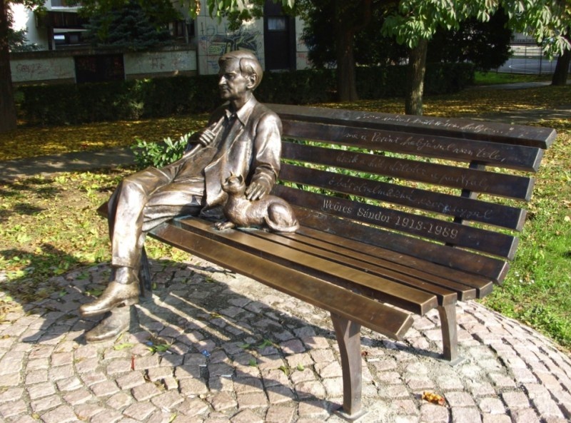 Weöres Sándor, a szombathelyi születésű költő 2007 óta ücsörög a cicájával az MMIK és az egyetem közti sétányon. Veres Gábor szobrásznak köszönhetjük, hogy lehuppanhatunk melléjük.