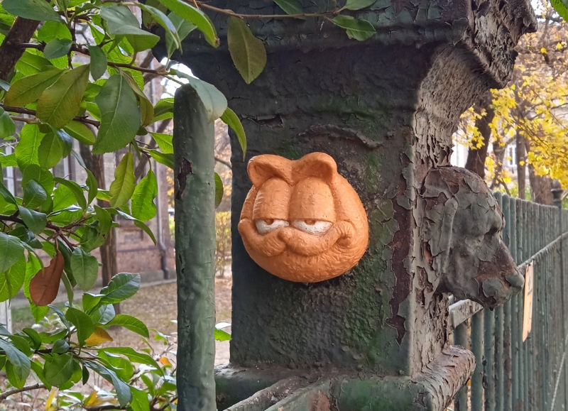 Nem megyünk messze sem térben, sem időben. Kolodko Mihály miniszobrai szerte a városban megtalálhatóak, jó pár állat van köztük, de csak egy macska. Az Állatorvostudományi Egyetem Dembinszky utcai kerítésére (ami megérdemelne egy renoválást, már csak az eredeti állatmotívumok miatt is) 2023 júniusában, Garfield 45. szülinapja alkalmából került fel a kis kövér képregényhős kis kövér feje.
