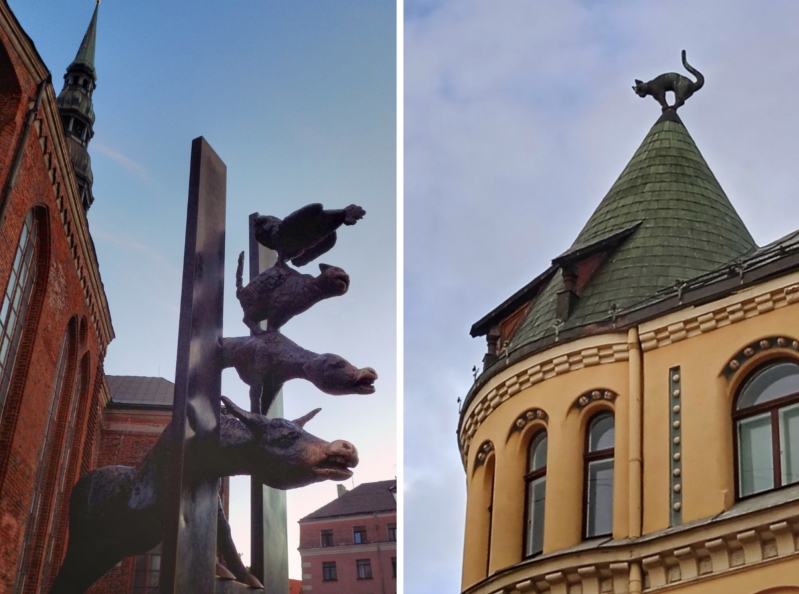 A lett fővárosban a brémai muzsikusokat találtuk meg elsőnek. Ők úgy kerültek ide, hogy Riga régi Hanza-város, egyben Bréma testvérvárosa. Christa Baumgärtel brémai művész alkotását Bréma ajándékozta 1990-ben. A Békeparkban lett volna felállítva, de a park végül csak terv maradt, így az állatok a Szent Péter-templom mellett találtak otthonra. Akárcsak az eredetiben Brémában, a szamár a hátsó lábain áll és ordít, rajta ugat a kutya, azon nyávog a macska, legfelől meg a kakas kukorékol, de az originál verzióval ellentétben itt az állatok résen keresztül néznek, ami a szovjet rezsim falain nyílt repedéseket jelképezi (Gorbacsov idején járunk). Az állatcsoport tulajdonképpen az új, felfedezésre váró világot figyeli.