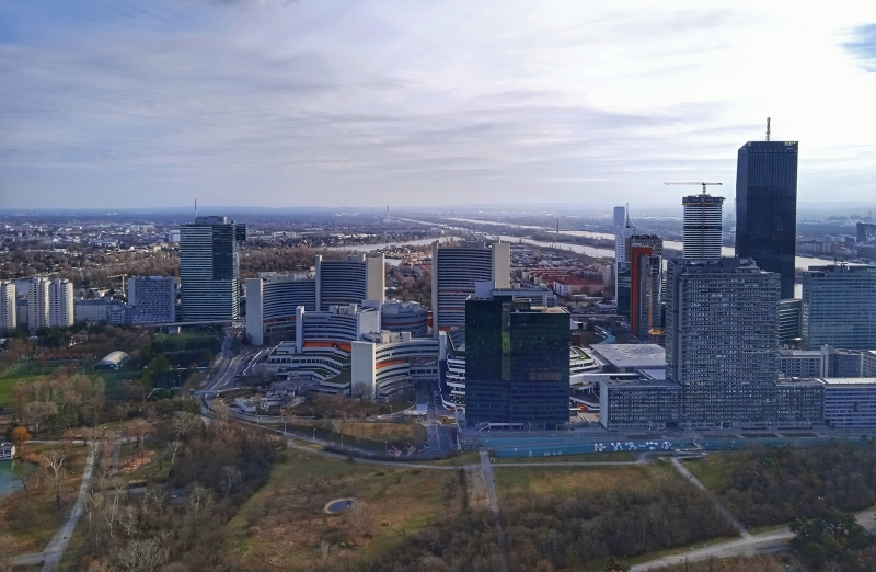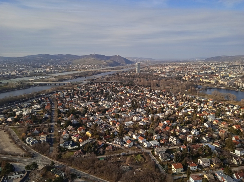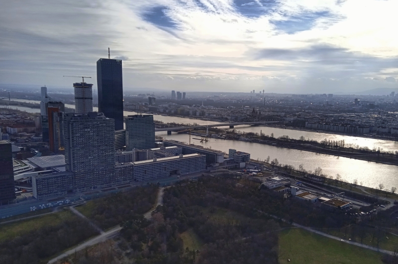 Fentről kiválóan látszik, hogy épül folyamatosan Donaustadt, Bécs felhőkarcolós városrésze:
