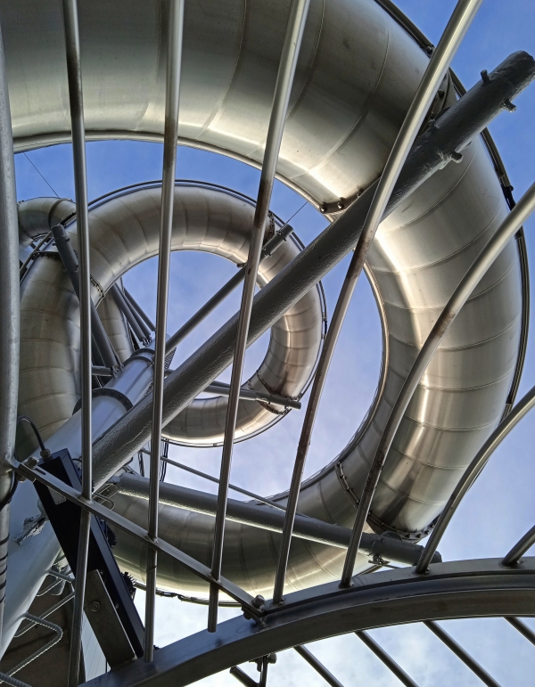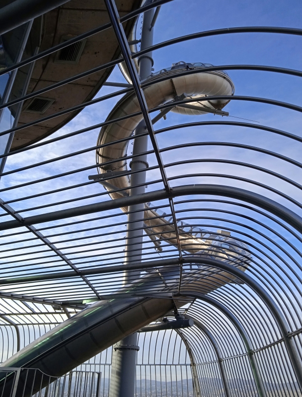 A közeli tó felől nézve így fest a torony a téli napfényben, emígy meg közeebbről, más szögből – a 2. képen a kilógó kis kunkorok a csúszda kanyarulatai:
