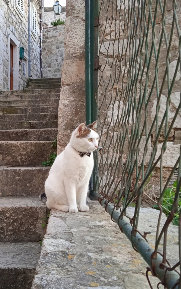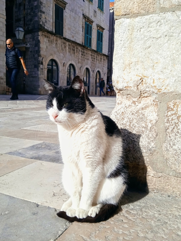 Örömmel jelentem: Dubrovnik is cicás város! Örömmel jelentem meg itt. Archibald, a Rektori palota reneszánsz rezidense a helyi kolónia releváns tagja (a középső képen); önkéntes szolgája, egy joviális úr naponta tálalja számára az ennivalót. Persze, jut belőle a többieknek is.