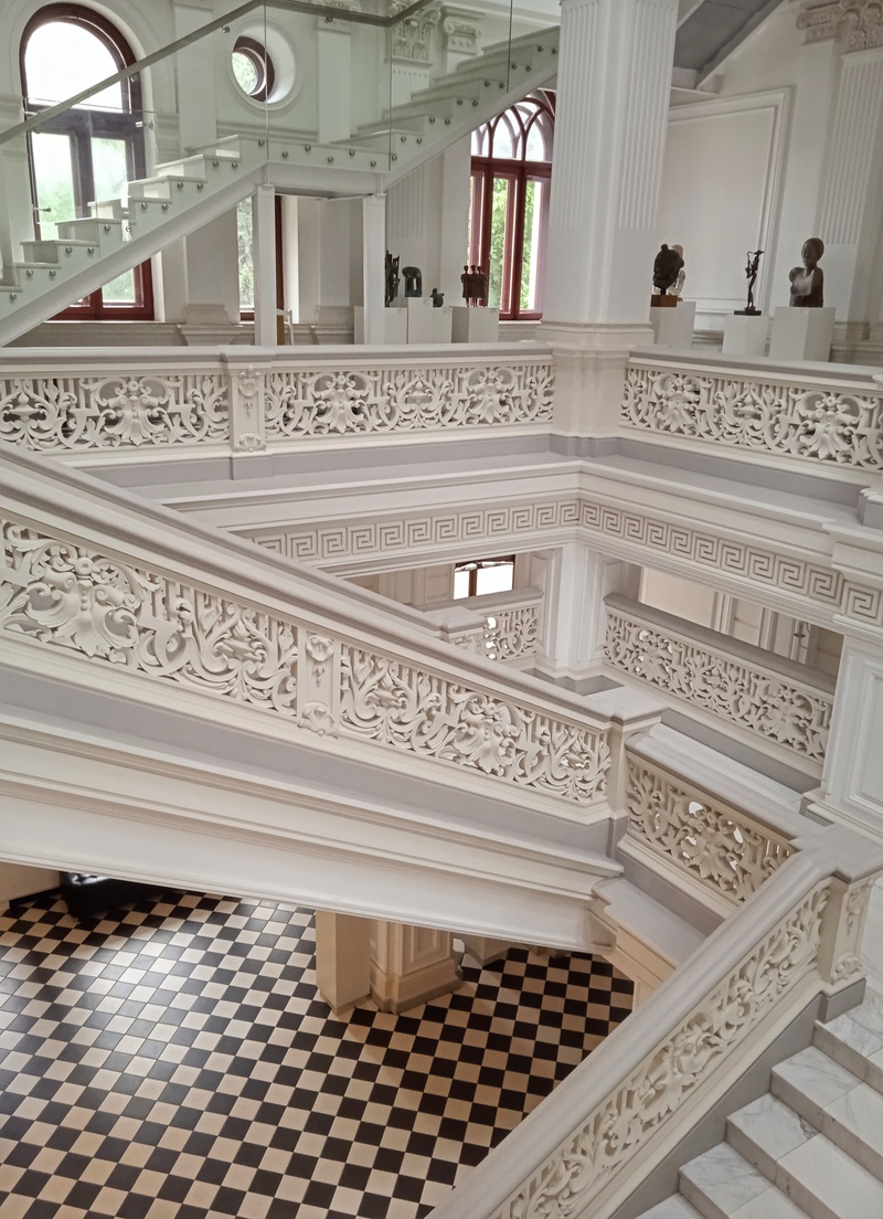 A két legjobb múzeum: a Moldovai Nemzeti Művészeti Múzeum (Muzeul Național de Artă a Moldovei) és a Nemzeti Etnográfiai és Természettudományi Múzeum (Muzeul Naţional de Etnografie şi Istorie Naturală). Közös vonásuk, hogy mindkettőbe 10 lei a teljes árú belépő (igen, az tényleg 200 forint), és hogy mindkettőt mint épületet is érdemes szemügyre venni. Mutatom. Külső felvétel: az Etnográfiai utcafrontja, benti: a Művészeti lépcsőháza.