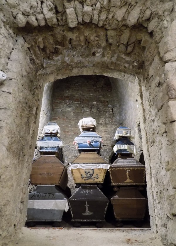 A váci domonkos templom 1994-es helyreállítási munkálatai során került elő a 150 évvel korábban befalazott kriptalejárat. Odalenn 262, többnyire jó állapotú színes-díszes koporsóban nyugodtak spontán mumifikálódott váci polgárok. Ezek a férfiak, nők és gyermekek a XVIII. század közepe és a XIX. század eleje közt távoztak az élők sorából. Testük a különleges klímának köszönhetően maradt fenn jó állapotban. Az őket bemutató állandó kiállítás a főtér egyik lakóházának középkori pincéjében található.
