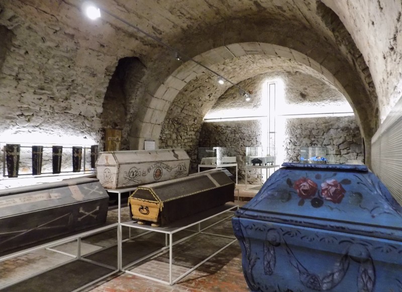 A festett, színes koporsókon látható Krisztus-ábrázolások, vallásos és halálszimbólumok a korabeli ember vallási világképére, halálhoz való viszonyára is utalnak. A teremben nyugszik Stefanovics György szabómester, egy középkorú polgárasszony, akinek nem tudni a nevét, és egy 9 éves kislány, Salamon Magdolna, üvegkoporsóba zárva.
