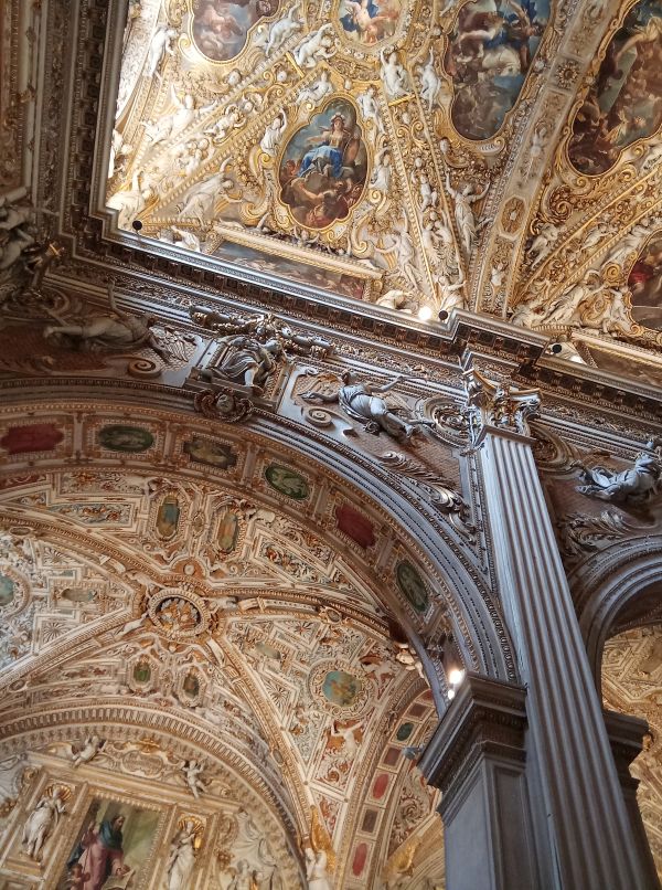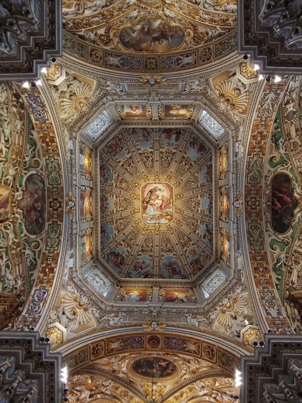 Az impozáns belső térben a rengeteg díszítés mellett a falakon Szűz Mária életét ábrázoló, XVI-XVII. századi firenzei és flamand falikárpitok láthatók. Az egyik kárpit fölött kapott helyet Luca Giordano festménye, a Vörös-tengeren való átkelés jelenetével (1691).