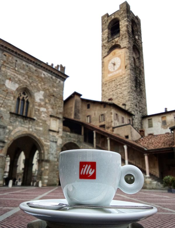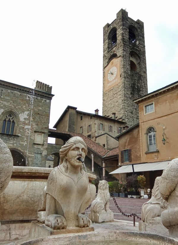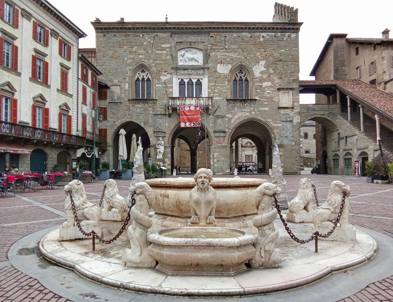A Città Alta a város szíve, fenn dobog a dombon, és bővelkedik funkcionális oroszlánokban. Bergamo meglehetősen régi város, a rómaiak Bergomumnak nevezték, de már előttük is éltek itt népek, noha akkor még a kávézás sem volt feltalálva, pedig az se utolsó dolog, például a láncos szökőkutas kép bal oldalán látható Bar Della Bottega teraszán.