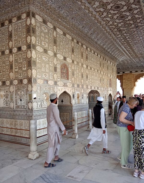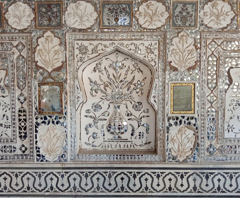 A palota közepén találjuk a Sheesh Mahal (Tükörpalota) nevű részt, ami rendkívül gazdagon díszített ficakja a helyszínnek, üvegberakásos panelekkel és soktükrös mennyezettel. A tükörmozaikoknak és a színes üvegeknek köszönhetően az esti gyertyafényben ragyogóan csillogott az egész tér.