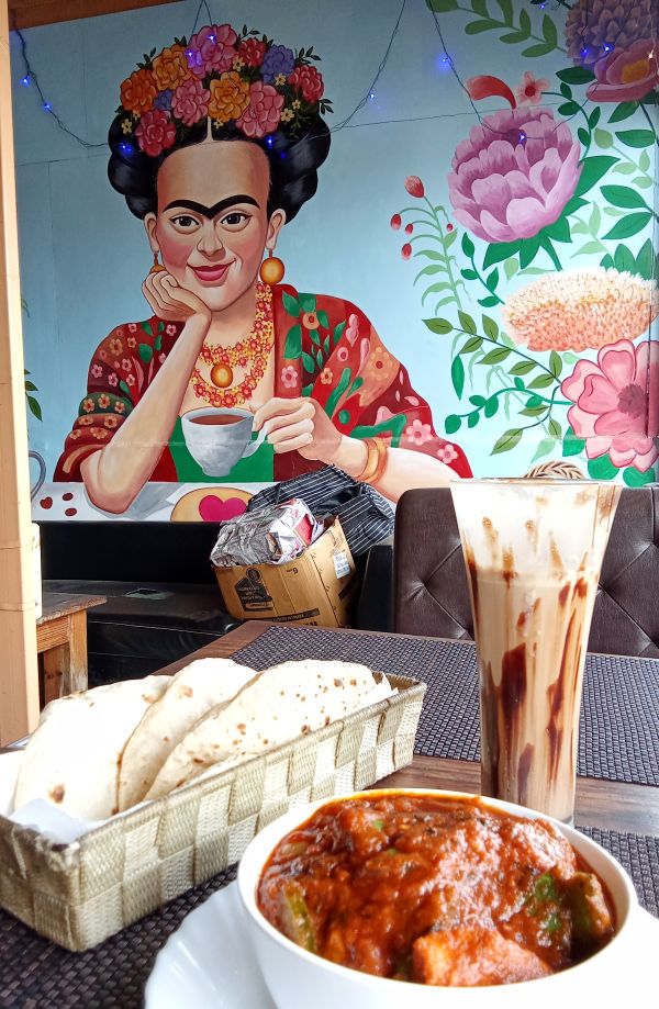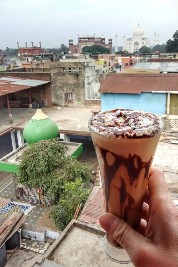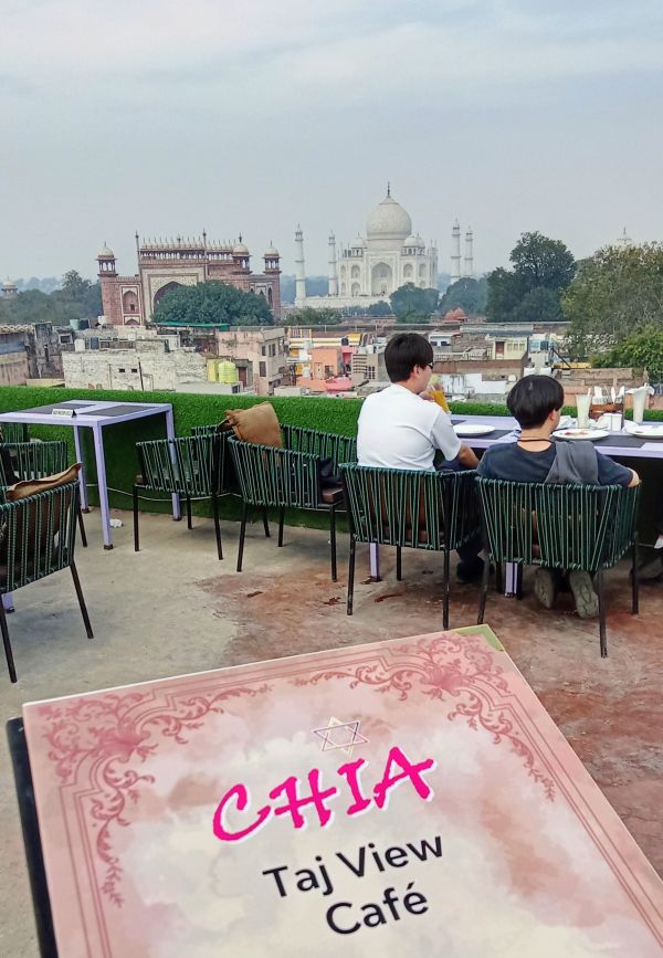 A kultúrprogram után arccal a gasztronómia felé: a Chia Taj View Café, aminek tetőteraszáról a Taj Mahal is látszik, szimpatikus egység. Chicken tikka masala, tawa roti (csapáti), jeges kávé. Desszertet nem kérek, mondom a főúrnak, hogy köszönöm, tele vagyok, mire ő egy kanapéra mutat, hogy ha gondolom, nyugodtan lefekhetek. Kiderül, hogy én vagyok a második magyar, akivel találkozik, ennek örömére rögtön megígértem neki, hogy mindenképp megemlítem a helyet, ha írok Indiáról. Tessék.