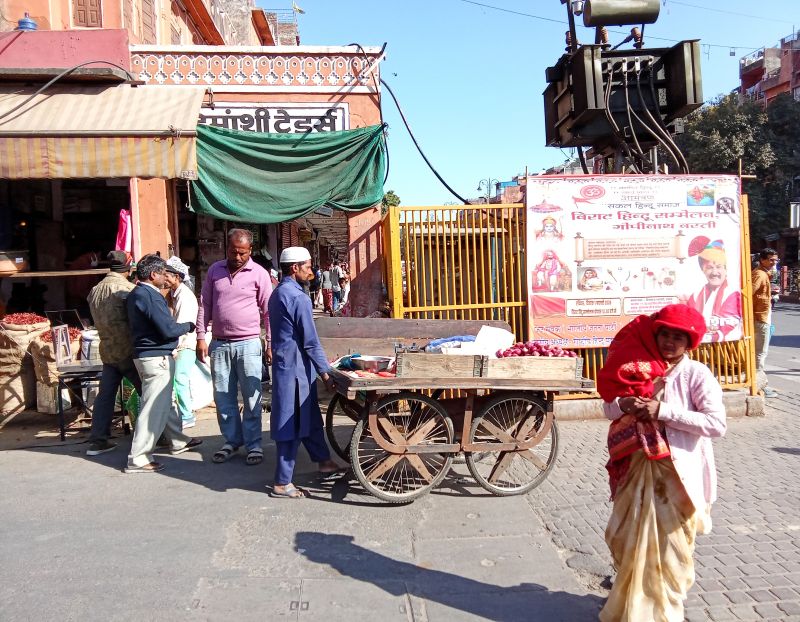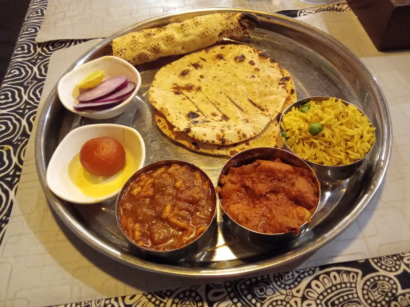 Ideje ebédelni valahol. Térképről nézek ki egy jó értékelésű, autentikusnak tűnő helyet. A közeli Vintage Kitchen Restaurant nem okoz csalódást, jaipuri thali kerül asztalomra. A thali többféle fogást jelent egy tálcán. Hogy az itteni verzió pontosan mit tartalmaz, azt ugyanolyan gyorsan felejtem el, mint ahogy a pincér elsorolja. Mindegy, jó volt.