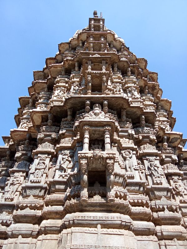 Az épület a mahaméru-praszáda templomtípus szép példája. Ez a hindu építészetben olyan szentélyforma, amely a mitikus Meru-hegyet szimbolizálja, több szintben emelkedő, toronyszerű felépítésével a kozmosz középpontját idézve meg. De nem csak a templom külalakja van rám hatással, hanem az a tény is, hogy odabenn a templomszolga mindennap újrafesti a szentély szobrain a sminket. Én is kapok egy sáfrányos pöttyöt a homlokomra.