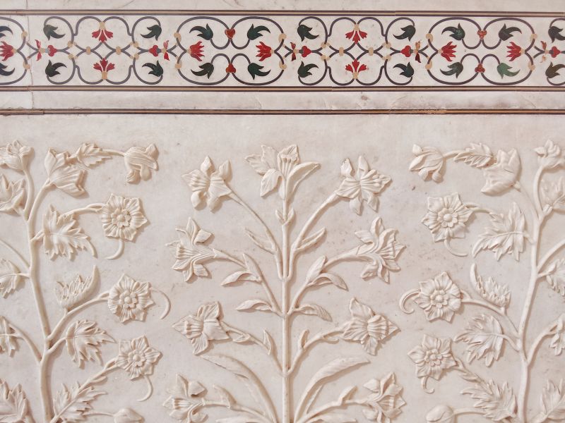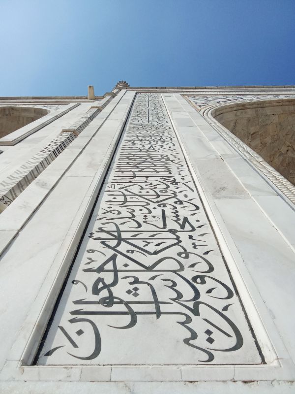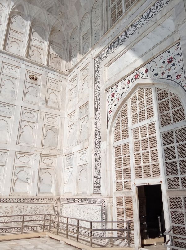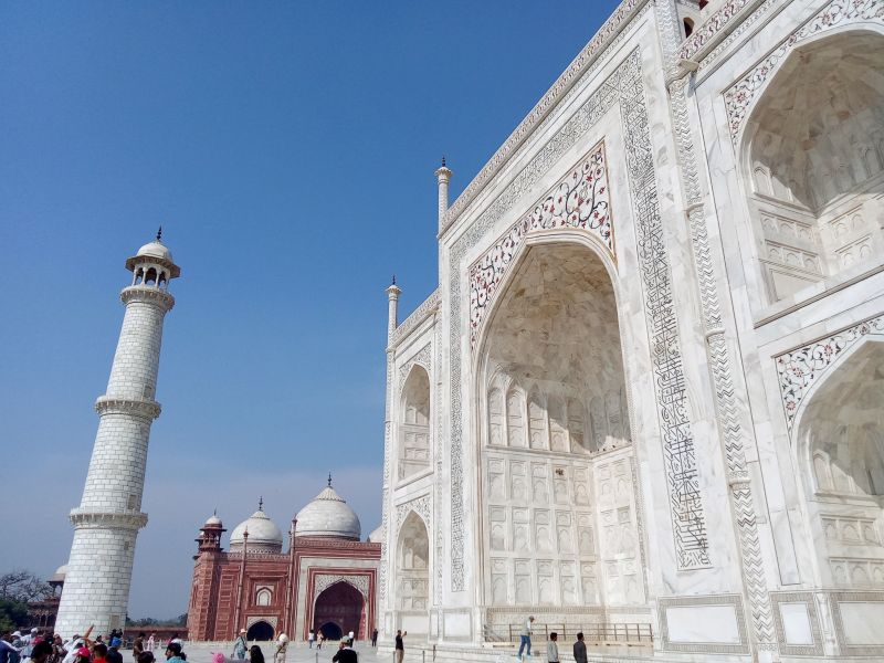 A virágmotívumokkal és feliratokkal díszített márvány felületek minden napszakban más hangulatot árasztanak, attól függően, hogy a felkelő, a magasban ragyogó vagy a lenyugvó nap világítja meg. (Én délelőtt voltam, szóval a képeimen klasszikus fehér.) A fotókon a perspektíva miatt általában nem lehet észrevenni, de élőben igen, hogy a Taj Mahal minaretjei szándékosan kifelé dőlnek. Ennek fő oka a biztonság: ha egy földrengés vagy más katasztrófa miatt leomlanának, ne a főépületre (a síremlékre), hanem attól távolabb dőljenek. Így védik a központi mauzóleumot.