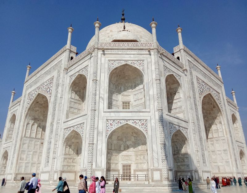És akkor végre a Taj Mahal. Tudom, a magyar átirat szerint Tádzs Mahal, de az angol neve sokkal elegánsabb, a hindi ताज महल még inkább, a perzsa تاج محل meg különösen. Tényleg tökéletes. A paloták koronája – ezt jelenti a neve. 1983 óta az UNESCO világörökség része.