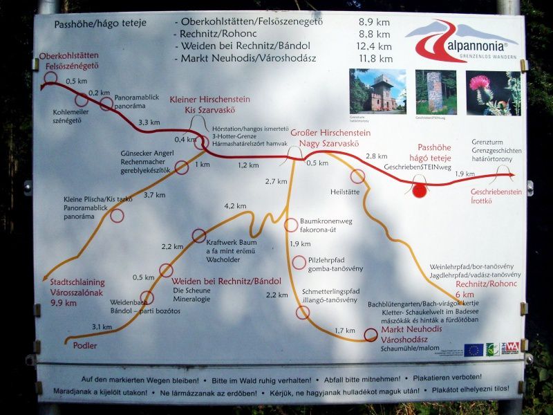 Írott-kő (Geschriebenstein) is the highest point of the Kőszeg Mountains, as well as of Transdanubia and Burgenland, standing at 884 meters. Its name comes from an inscribed border stone that marked the boundary between the Esterházy and Batthyány estates. The stone lookout tower at the summit was built in 1913; interestingly, the tower stands on the Hungarian side, while its entrance opens from Austria. Írott-kő is the western terminus of the National Blue Trail, the centerpiece of the Írottkő Nature Park, and part of the Alpannonia hiking route, which stretches from Semmering to the vineyards of Kőszeg.